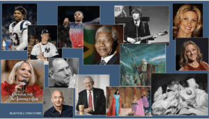 Everyone has a story. Looking at the pictures on this slide, you may be familiar with the publicly known stories of some of these individuals: Kyle Van Noy, Aaron Judge, Simone Biles, Nelson Mandela, John Lennon, Faith Hill, Sarah McLauchlan, Kristin Chenoweth, Steve Jobs, Jeff Bezos, Dave Thomas, Moses, Esther, and Joseph and Julia Murdock Smith.
